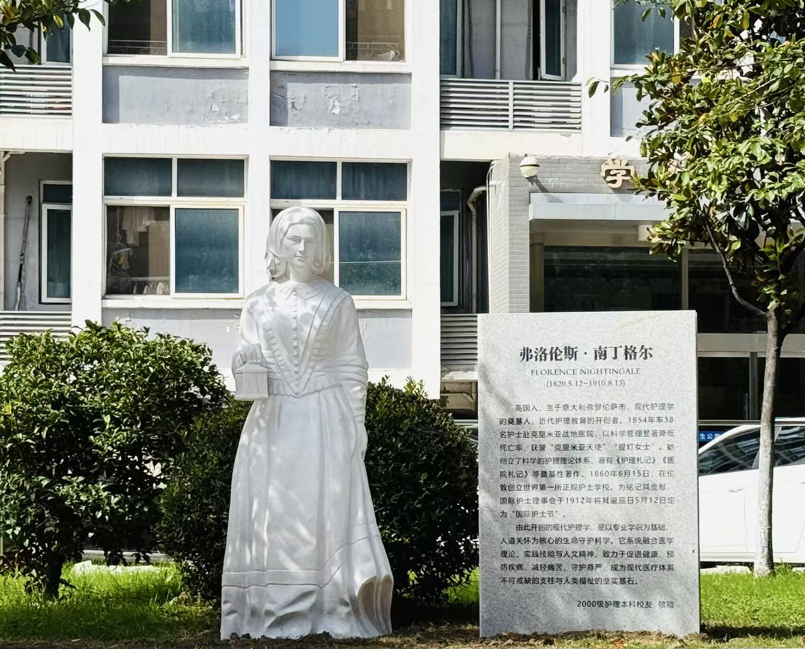 近日,一座庄重典雅的南丁格尔雕像静静伫立于徐州医科大学五四广场北侧草地,成为校园内一道温暖而富有深意的人文风景。该雕像由护理学院2000级全体校友集体捐赠,旨在致敬护理职业精神、感恩母校培育之恩。在合作发展处与后勤管理处的全力支持与协调下,雕像选址与安装工作顺利完成,现已正式落成并向全校师生开放。