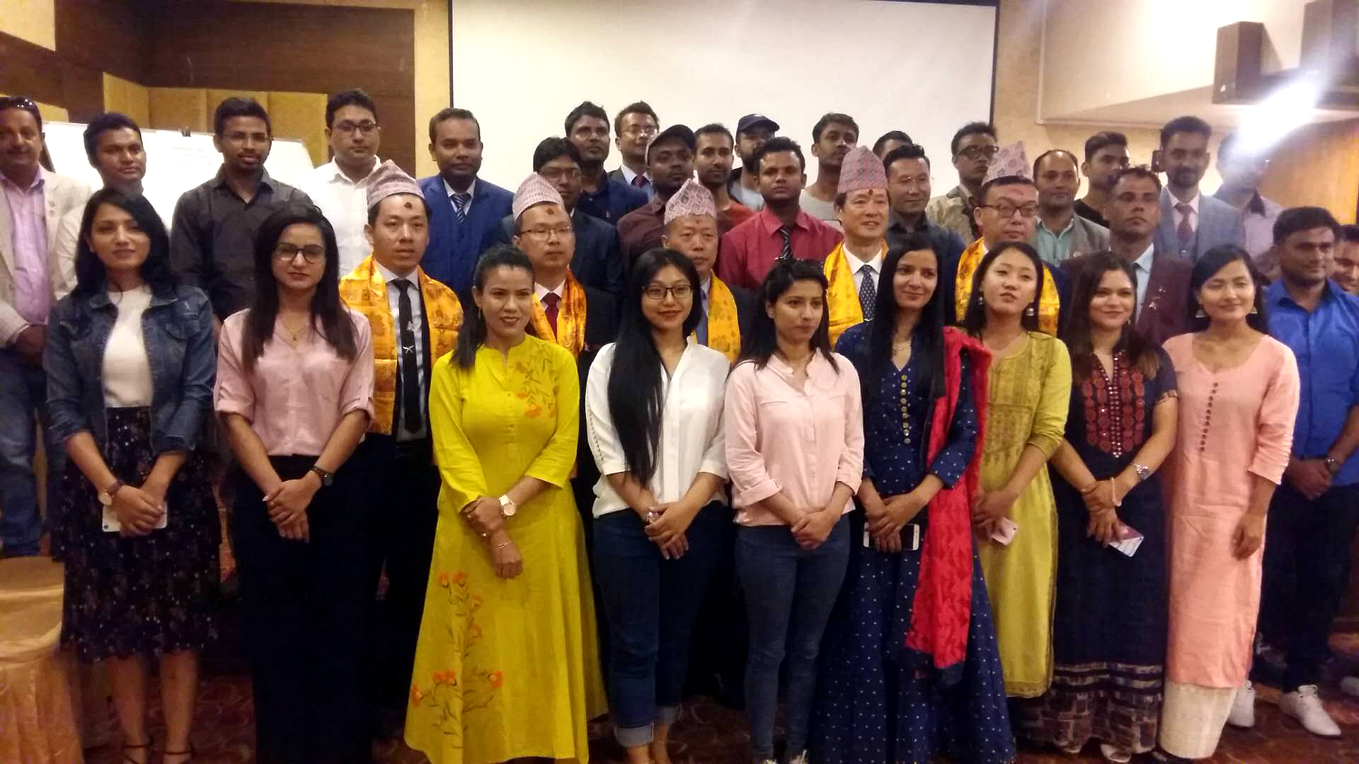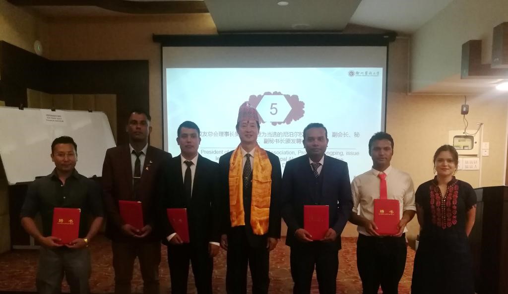 李海洋秘书长宣读尼泊尔校友会会长、副会长、秘书长及副秘书长候选人名单。吴永平理事长为当选的校友们颁发聘书,并与校友会会长Abhimanyu Chand代表双方互赠礼品。